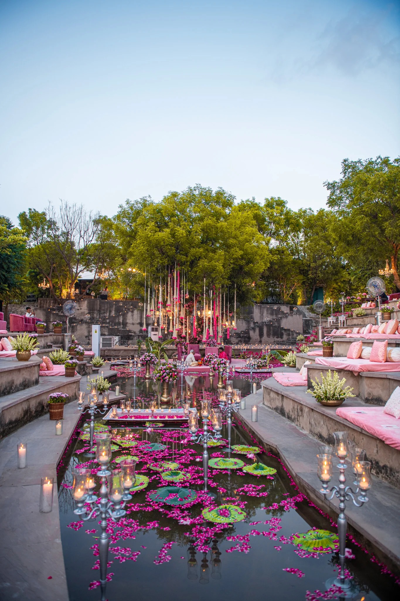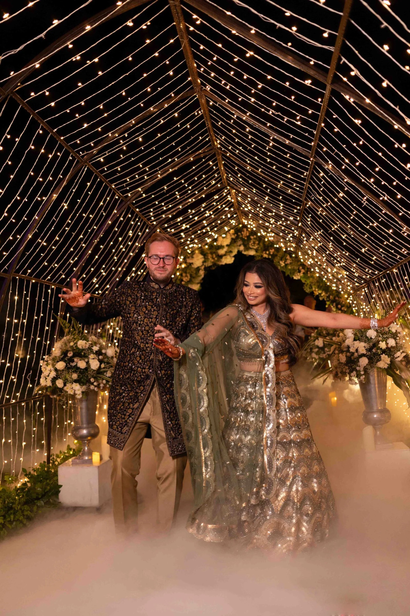 In a beautiful intercultural celebration, Michael, a British groom, and Sangeeta, an Indian-Bengali bride, tied the knot in a grand wedding at Alila Fort Jaipur. Their three-day celebration, from the 20th to the 22nd of September 2023, featured a unique floating mandap, with Konark Weddings designing and executing every detail of this spectacular event.